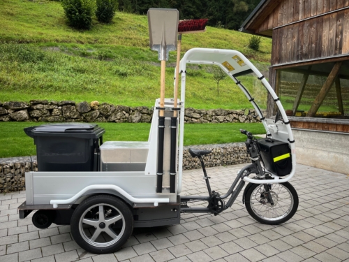 Nun steht er bereit: unser VeloBRING S mit einer hydraulischen Mülltonnenaufnahme für eine 240 Liter Tonne. Ob Müll, Streugut oder Laub… ab in die Tonne.