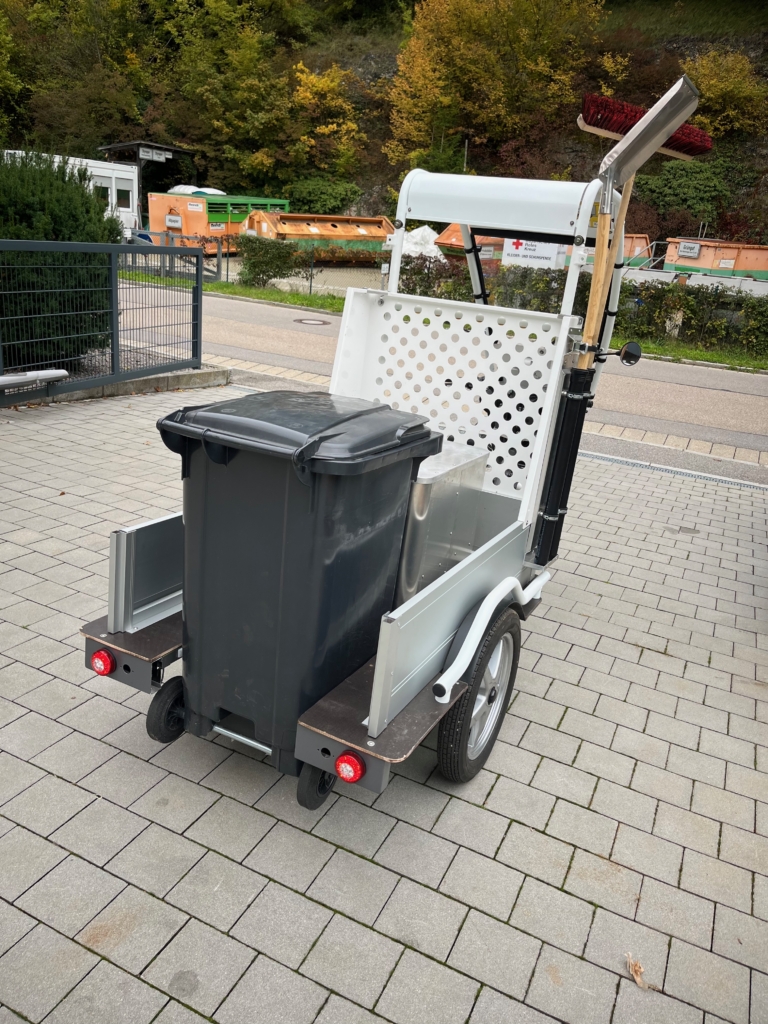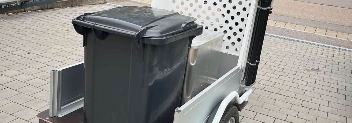 Nun steht er bereit: unser VeloBRING S mit einer hydraulischen Mülltonnenaufnahme für eine 240 Liter Tonne. Ob Müll, Streugut oder Laub… ab in die Tonne.